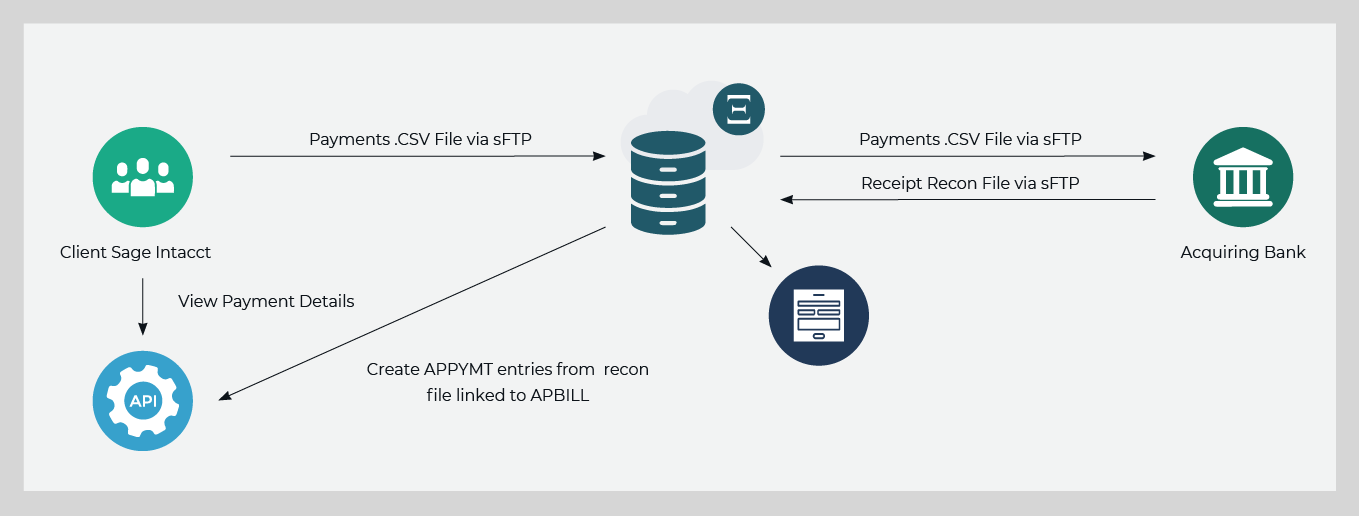 Our integration with Sage Intacct automates payments made by clients using APIs to pull approved bills or payments for settlement via the Card Issuer or Payment Processor. Once settled, it marks those bills or payments as paid by generating a reconciliation file.